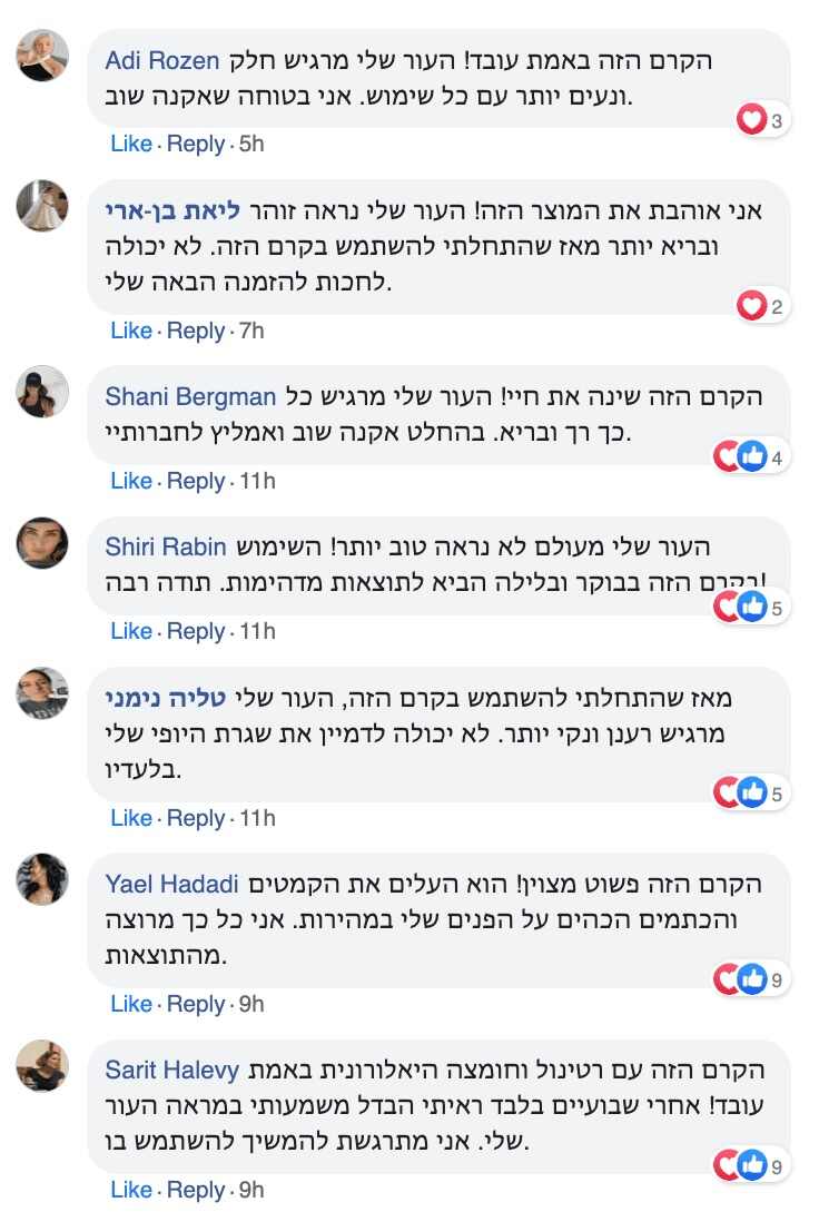 "השילוב של רטינול וחומצה היאלורונית בקרם הזה הופך אותו לאידיאלי לשימוש יום ולילה. העור שלי מרגיש רענן ומתוח יותר. ממליצה עליו לכל אישה המחפשת פתרון מושלם לעור."