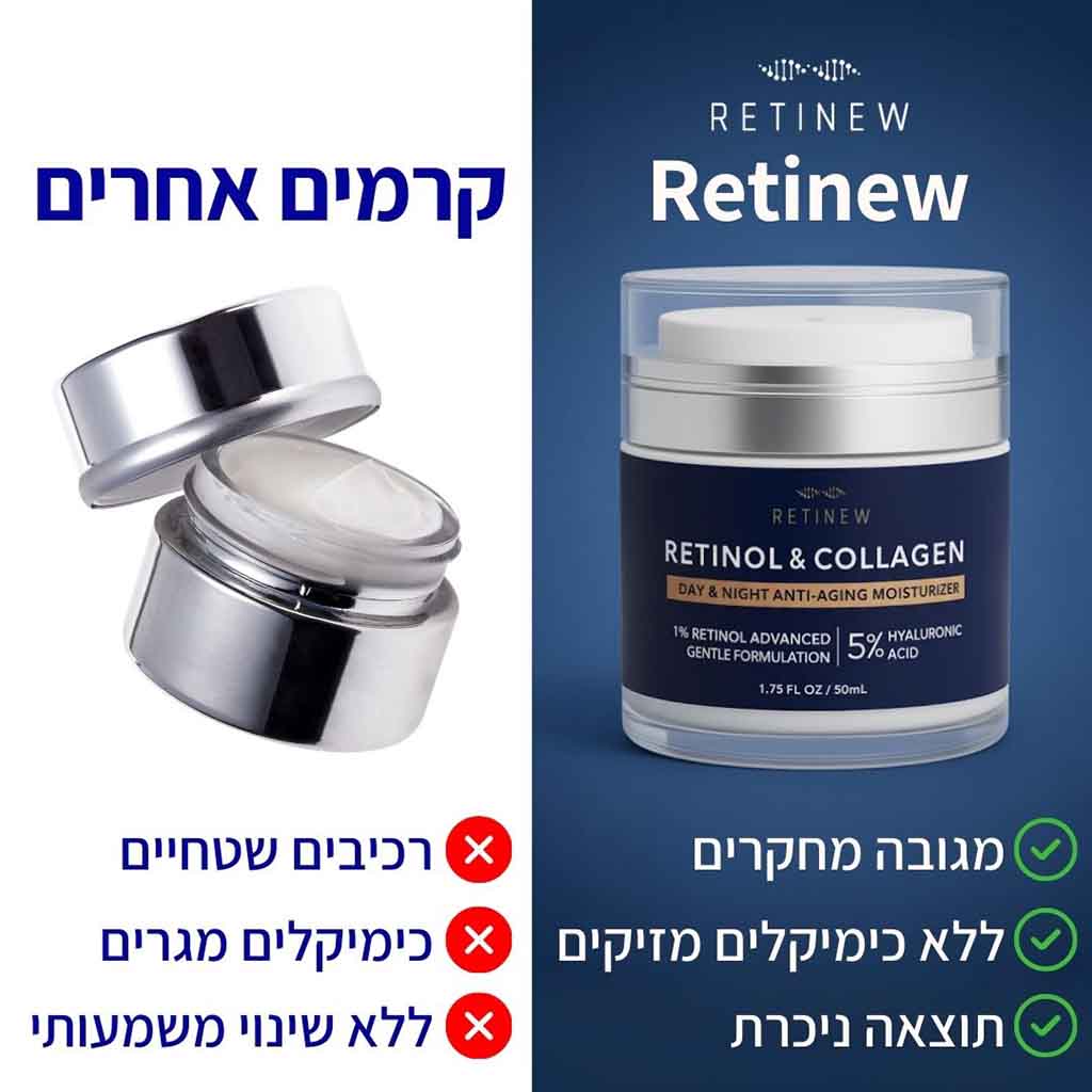 קרם הרטינול Retinew משלב את הרכיבים החזקים ביותר בטיפוח העור כמו רטינול, קולגן וחומצה היאלורונית. רכיבים אלו ידועים ביכולתם לשפר את מרקם העור, להחליק קמטים ולהעניק לחות עמוקה וזוהר לעור. אלפי לקוחות מדווחות כי לאחר תקופה של שימוש עקבי. בזכות השילוב המדויק, הקרם שלנו מעניק תוצאות ניכרות לעין.
