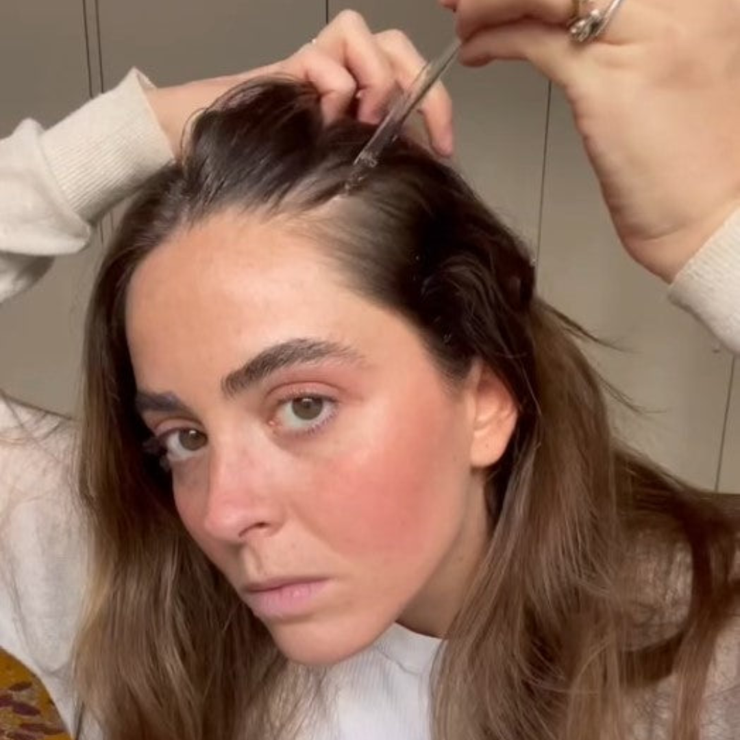 טפטפי כמה טיפות של RoseGlow על קצות האצבעות או ישירות על הקרקפת, בהתאם להעדפותיך ולצפיפות השיער.