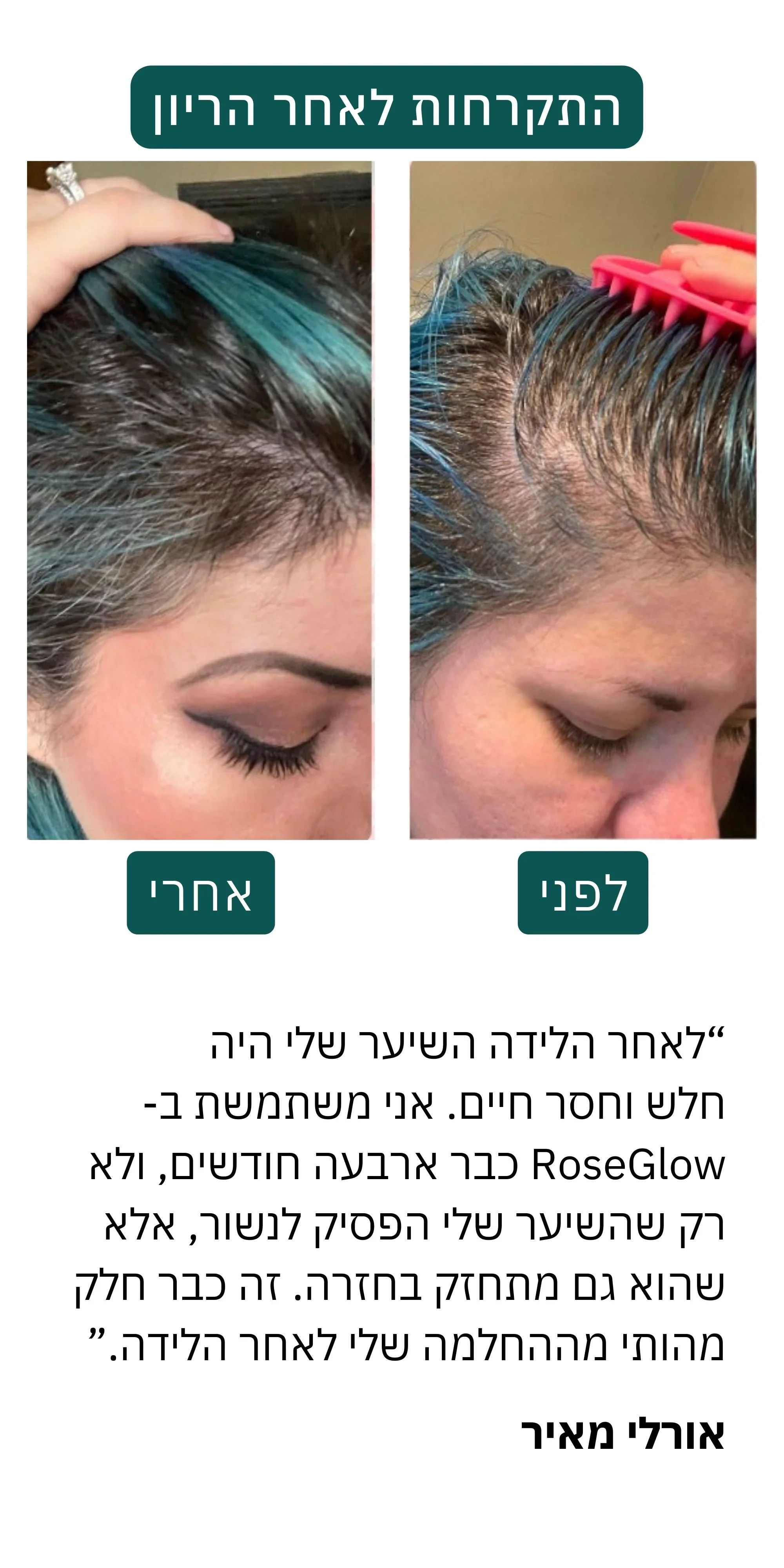איבדתי תקווה אחרי שתי קרחות אחרי לידה. זה היה כל כך מביך ולא יכולתי לאסוף את השיער. ניסיתי את המוצר הזה ואחרי חודשיים השיער באותם מקומות צמח בכחצי סנטימטר. תודה רבה!