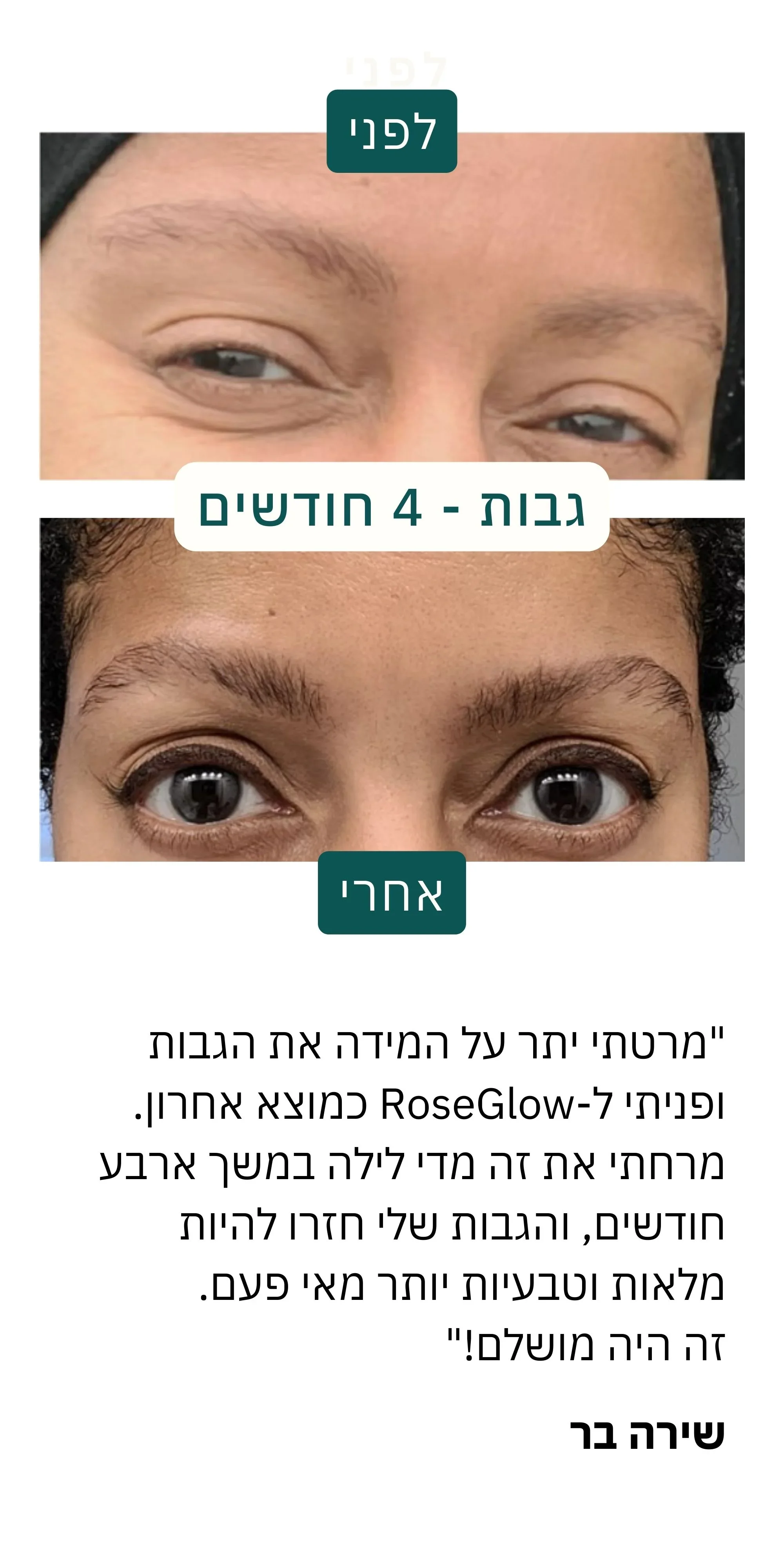 "אני בת 45 וסבלתי מנשירת שיער במשך שנים. אחרי שימוש של חודשיים ב-RoseGlow, השיער שלי התחיל לצמוח בחזרה והוא נראה בריא ומבריק יותר מאי פעם. המוצר הזה החזיר לי את הביטחון העצמי. ממליצה בחום!"