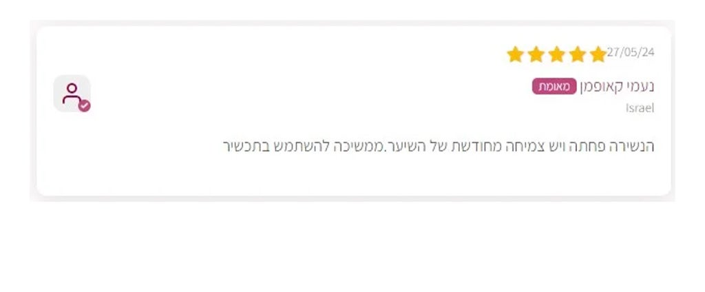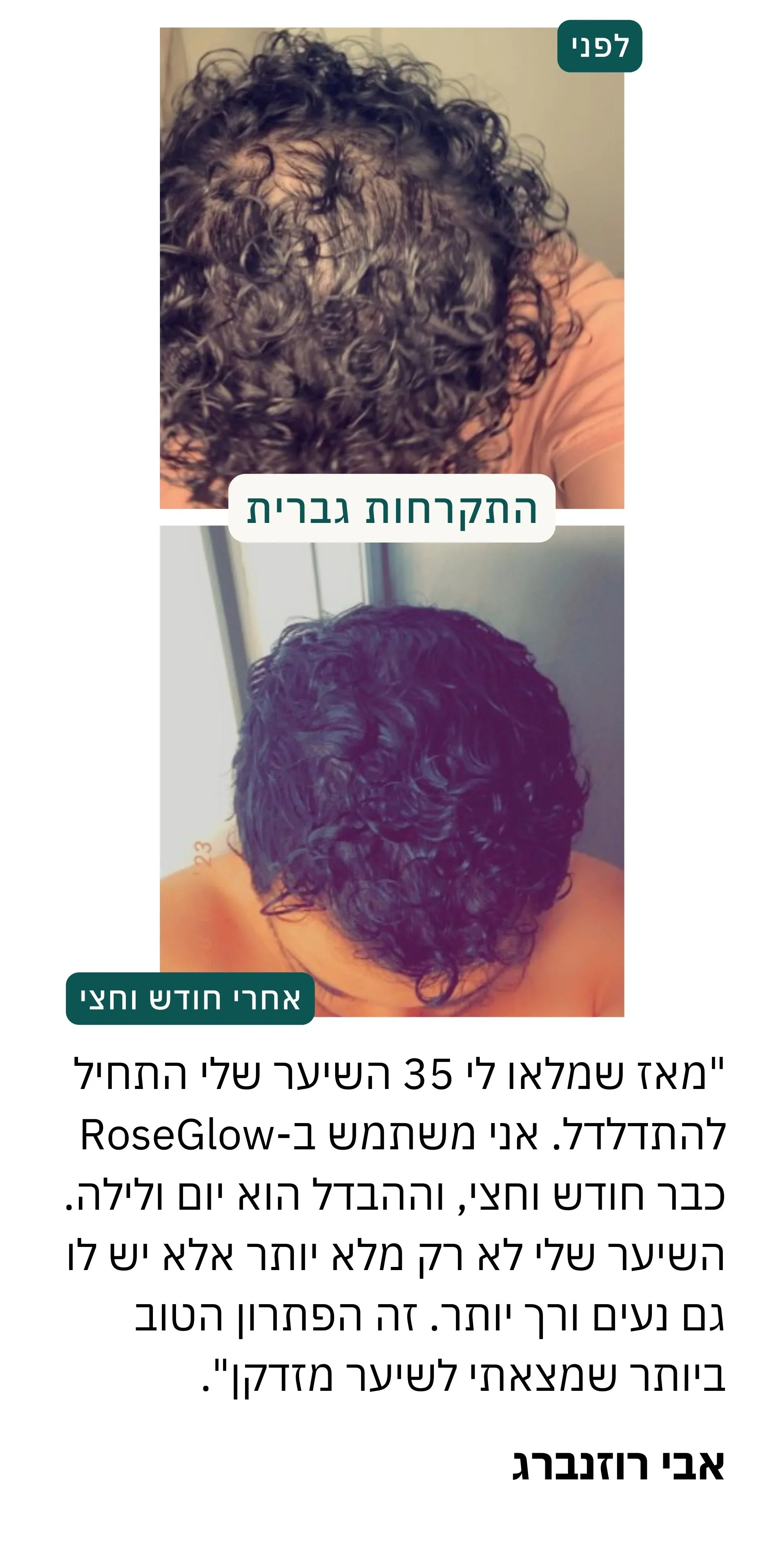 ״ לא האמנתי שזה יקרה. אחרי אין־ספור ניסיונות עם מוצרים אחרים, RoseGlow פשוט שינה לי את השיער. הנשירה פחתה משמעותית,