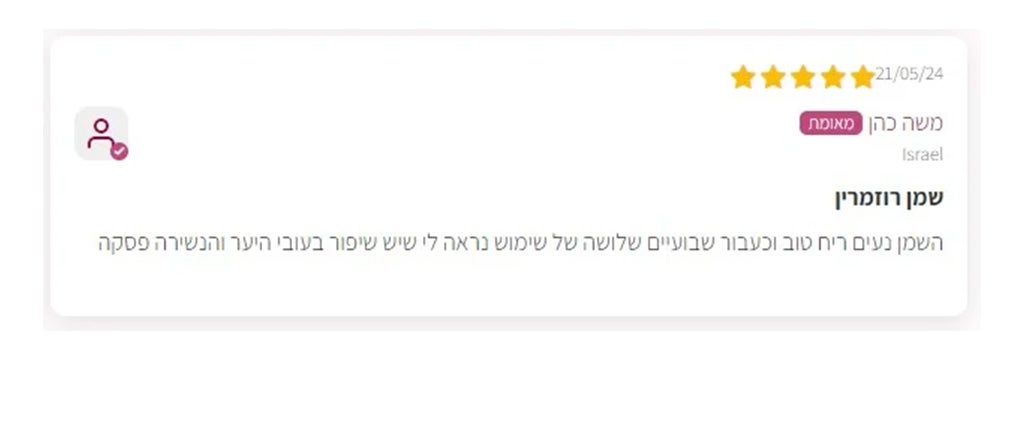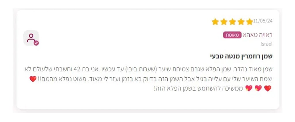 אני בת 42 ולפני כמה חודשים ילדתי את הילד השני שלי. אחרי הלידה התחלתי לאבד הרבה שיער. רופאת העור עשתה בדיקות דם והמליצה לי על שמן רוזמרין לשיער. כל לילה אני מורחת אותו על הקרקפת, במיוחד בקו השיער ובאזורים הדלילים, וקושרת במטפחת משי. בבוקר אני שוטפת עם שמפו ומרכך. אחרי שבוע שמתי לב שפחות שיער נושר, ואחרי חודש ראיתי צמיחה חדשה. למרות שהשיער נראה שמנוני בבוקר, זה שווה את זה כי השיער שלי חוזר לצמוח!